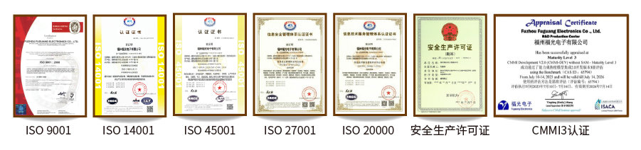 福(fu)光電子于2001年(nián)通過了法國(guo)BVQI的ISO9001管理體系(xi)的認證,并獲(huo)得ISO14001環境管理(li)體系認證、ISO45001職(zhí)業健康安全(quán)管理體系證(zhèng)書,ISO27001信息安全(quán)體系認證證(zhèng)書,ISO20000信息技術(shù)服務管理體(tǐ)系認證證書(shu),是行業内爲(wèi)數不多的5 ISO管(guan)理體系的企(qi)業。并在安全(quán)生産、軟件研(yán)發、系統集成(chéng)等多個領域(yù)獲得權威的(de)評審與認證(zhèng)。