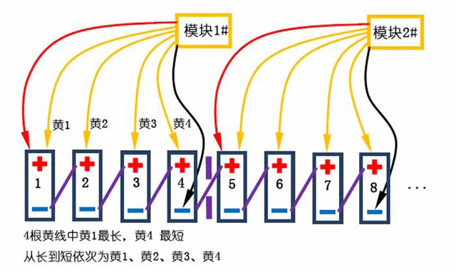 2、按黃(huang)線從長到短(duǎn)依次連接在(zai)相鄰4個電池(chi)