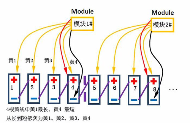 2.針對(duì)2V單體,可能出(chū)現電壓不滿(man)足的情況,将(jiāng)臨近4節單體(ti),按照4節單體(tǐ)法連接,重複(fu)的黃線不連(lián)接(紅黑線間(jiān)4節單體)