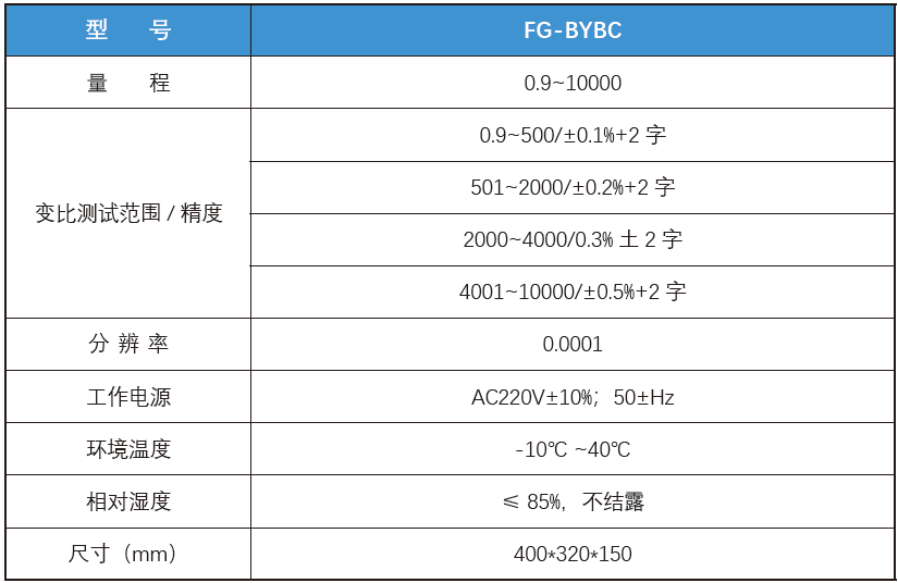 快(kuài)速測試:采用(yòng)三相輸出電(diàn)壓,三相加壓(ya),三相同時測(cè)量,提高測試(shì)速度,可以很(hěn)輕易的自動(dong)識别變壓器(qi)接線組别0-11技術參數(shu)