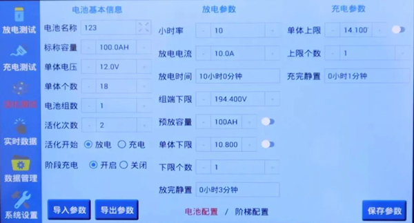 針(zhen)對容量降(jiang)低、性能下(xià)降的電池(chi)組,可通過(guò)設置多次(ci)循環充放(fàng)電激活電(diàn)池活性,提(tí)升整組電(diàn)池性能。