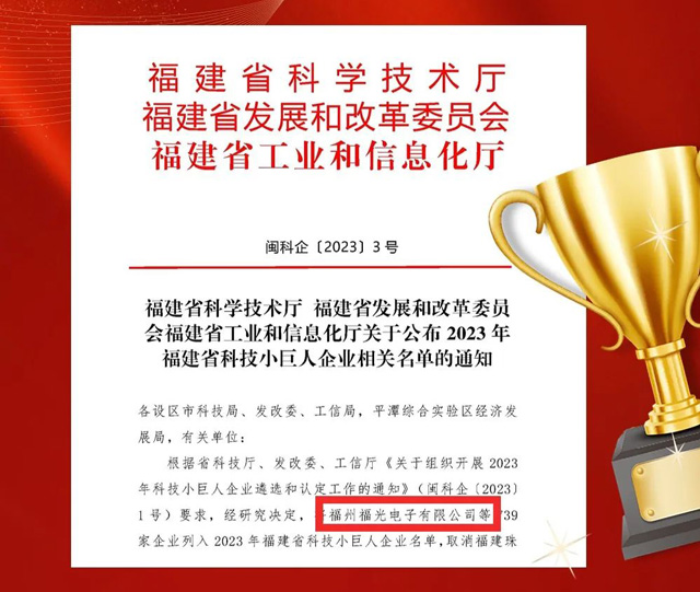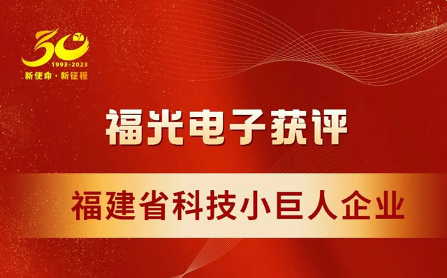 2025年12月4日,根(gēn)據省科技廳(tīng)、發改 委、工信廳(ting)發布的《關于(yu)組織開展2023科(kē)技 小巨人企業(yè)遴選和認定(ding)工作的通知(zhī)》,福州 福光電子(zi)有限公司被(bei)評定爲【福建(jiàn)省科技小 巨人(ren)企業】。這是政(zheng)府部門對福(fu)光科技創新(xin) 工(gōng)作的認可,也(yě)是對福光市(shi)場發展潛力(li)及綜 合實力的(de)高度肯定!