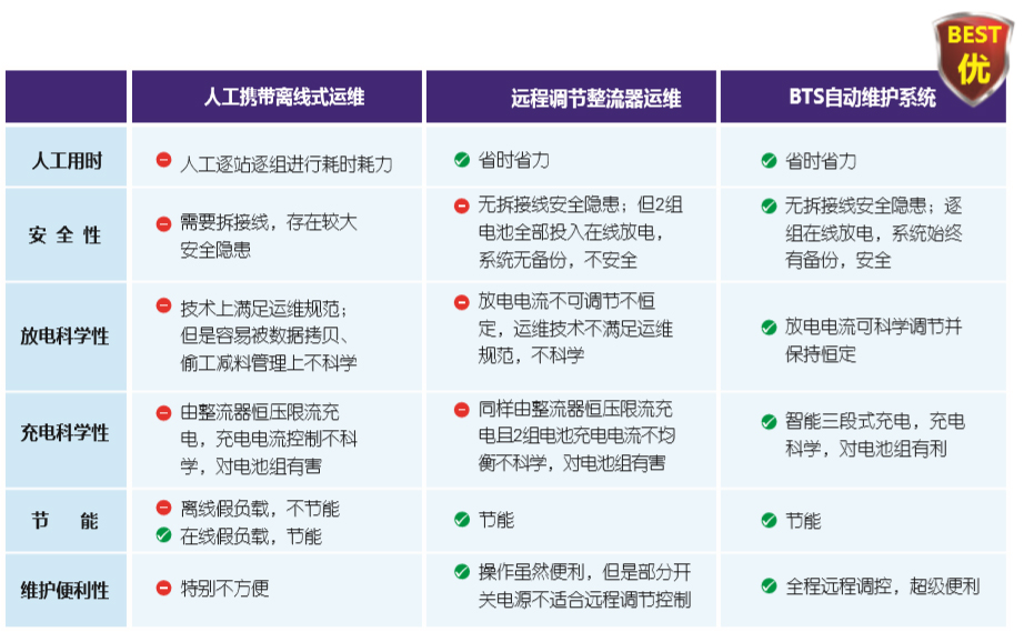結論:BTS系統(tǒng)從人身安(ān)全、放電科(kē)學性、節能(néng)環保、維護(hu)便利性等(deng)方面各項(xiàng)指标均優(yōu)于傳統維(wei)護技術