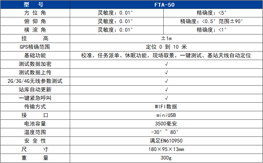 ● 測量高效(xiao)、簡便性:以電(dian)子化方式單(dan)手操作一鍵(jian)測試、自☁️動存(cun)儲、一鍵上傳(chuan)、數據同步一(yī)次性記錄方(fāng)位角、挂高、 經(jīng)緯度、無線♌參(can)數等